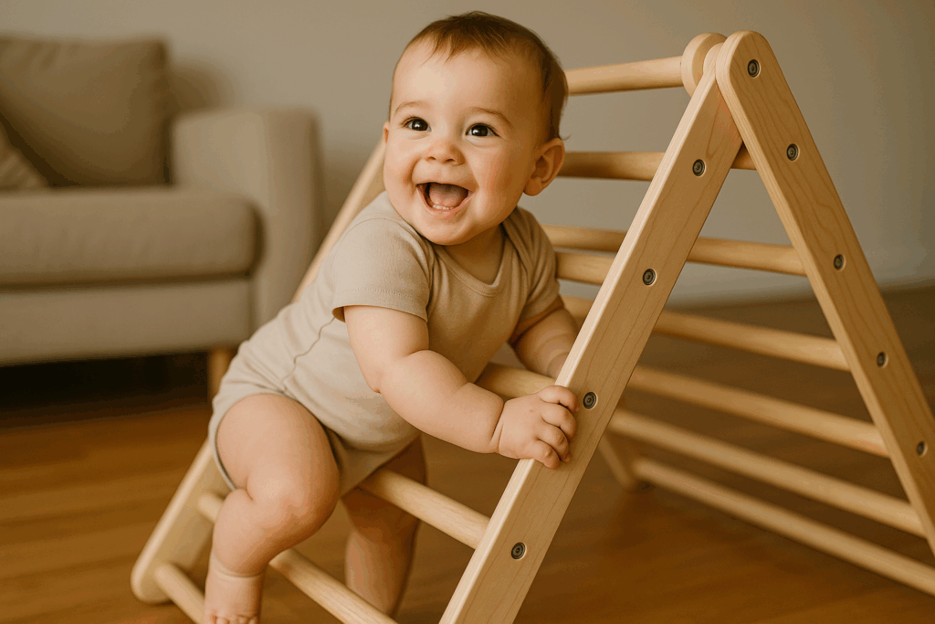 Wir haben unser Pikler-Dreieck zum 1. Geburtstag verschenkt – ein Modell, das man immer wieder umbauen kann. Das war ein echter Gamechanger. Schon früh konnten sich unsere Kids daran hochziehen, mutig werden und ihre ersten kleinen Abenteuer wagen. Und das Beste: es bleibt spannend, weil es immer wieder anders ist. Noch heute mit knapp 5 Jahren klettert er darüber, rutscht runter, läuft die Rutsche hoch. Es ist auch super, um es in einen Indoor-Parcours einzubauen!