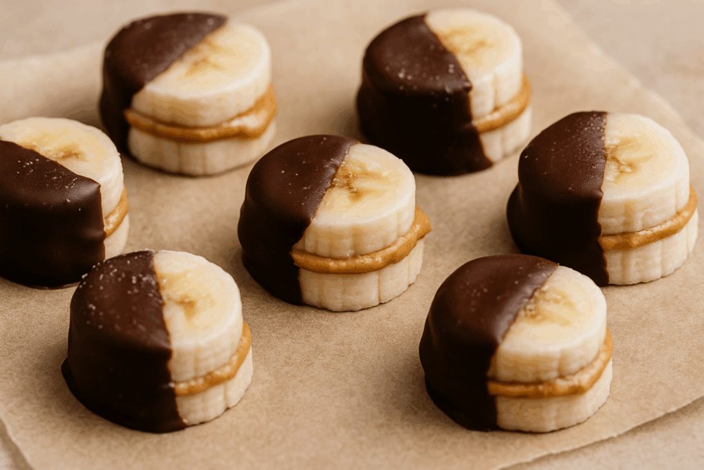 Gefrorene Bananenscheiben mit etwas Nussmus bestreichen, zusammenklappen, in geschmolzene Zartbitterschokolade tauchen und wieder einfrieren.