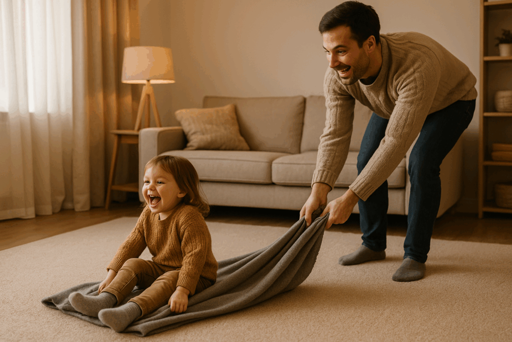 Oder: Nimm eine Decke, setz dein Kind drauf und zieh es durch die Wohnung.